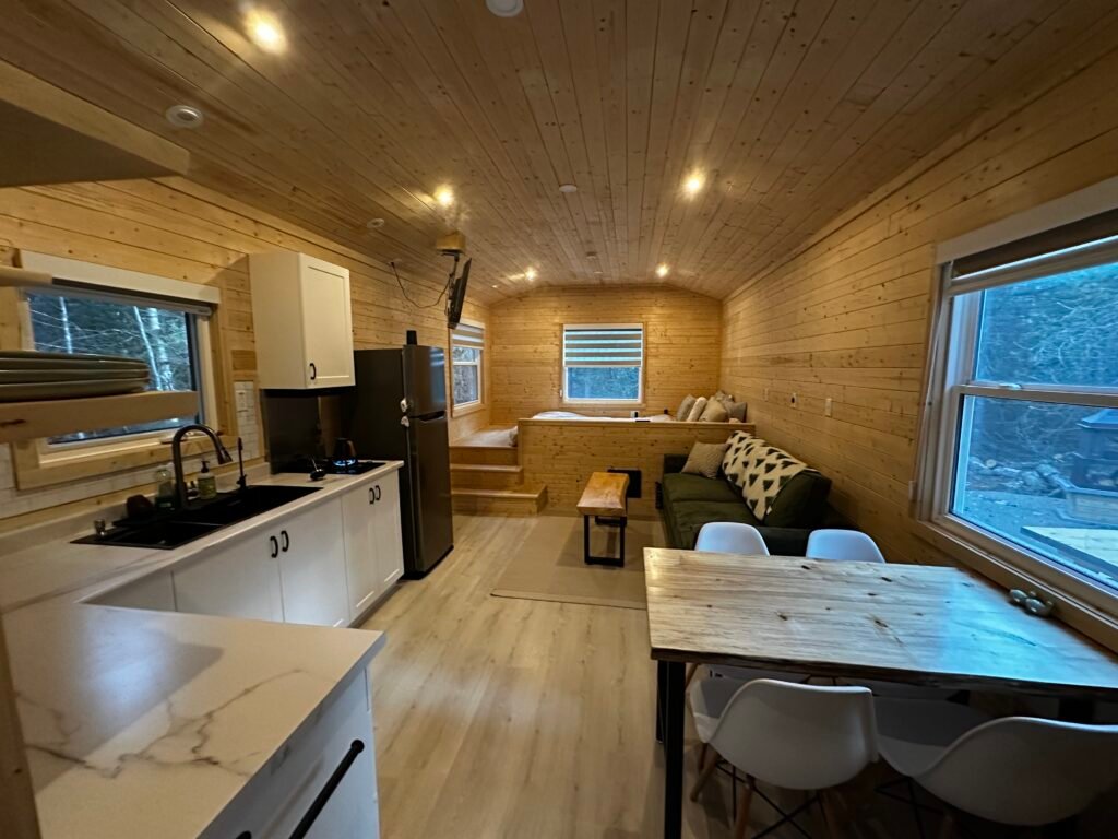 Nestled in a quiet pine grove just moments from the Atlantic shoreline, the Tide & Timber Cabin is a serene sanctuary for those seeking stillness, simplicity, and a deeper connection to nature. This thoughtfully crafted retreat combines the rustic charm of timbered interiors with the warmth of modern comforts. Expansive windows invite soft, natural light to pour in, framing views of the surrounding forest and creating a seamless blend between indoors and out.